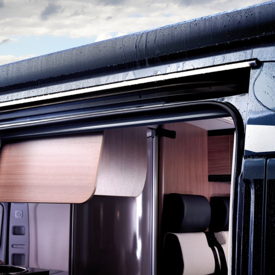 Tento elegantní hliníkový profil, dostupný v barvě černé, slouží jako dešťový okap nad posuvnými dveřmi vozidel jako Fiat Ducato, Citroën Jumper či Peugeot Boxer (modely od roku 2006) a efektivně odvádí vodu, když je dveře otevřené.